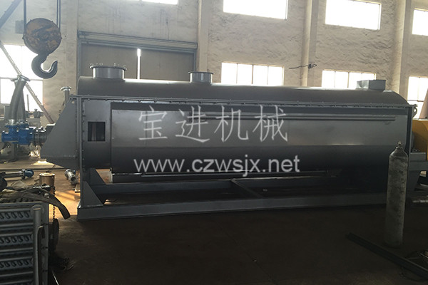 空心軸上密集排列著楔型中空槳葉,熱介質(zhì)經(jīng)空心軸流經(jīng)槳葉。單位有效容積內(nèi)傳熱面積很大,熱介質(zhì)溫度從-40℃到320℃,可以是水蒸汽,也可以是液體型:如熱水、導熱油等。間接傳導加熱,沒有攜帶空氣帶走熱量,熱量均用來加熱物料。熱量損失僅為通過器體保溫層向環(huán)境的散熱。楔型 槳葉傳熱面具有自清潔功能。物料顆粒與楔型面的相對運動產(chǎn)生洗刷作用,能夠洗刷掉楔型面上附著物料,使運轉(zhuǎn)中一直保持著清潔的傳熱面。槳葉干燥機的殼體為W型,殼體內(nèi)一般安排二到四根空心攪拌軸。殼體有密封端蓋與上蓋,防止物料粉塵外泄及收集物料溶劑蒸汽。出料口處設(shè)置一擋扳,保證料位高度,使傳熱面被物料覆蓋而充分發(fā)揮作用。熱介質(zhì)通過旋轉(zhuǎn)接頭,流經(jīng)殼體夾套及空心攪拌軸,空心攪拌軸依據(jù)熱介質(zhì)的類型而具有不同的內(nèi)部結(jié)構(gòu),以保證佳的傳熱效果。