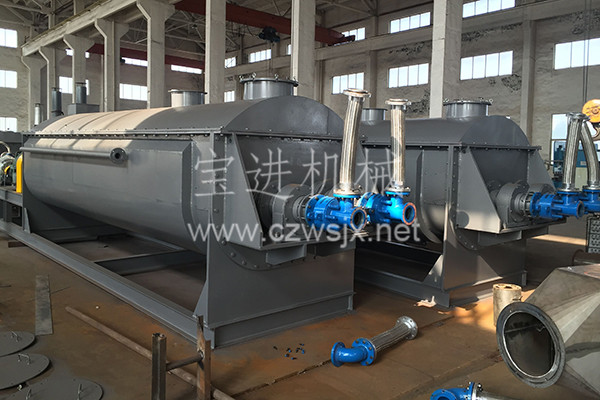 ● 槳葉干燥機能耗低:由于間接加熱,沒有大量攜帶空氣帶走熱量,干燥器外壁又設(shè)置 保溫層,對漿狀物料,蒸發(fā)1kg水僅需1.22kg水蒸汽。